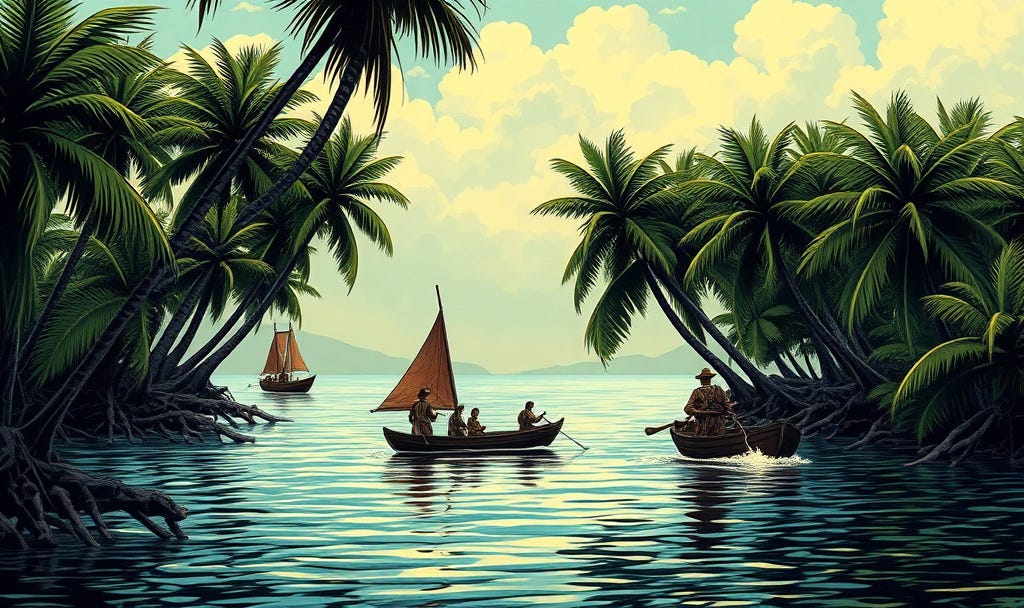 We anchored our ships at sea then from smaller vessels and boats we soldiers landed at Cape of the Palms, near the town of Tabasco. The river, riverbanks and mangrove swarmed with warriors. The people of Champoton and Lazaro and other towns looked down on our new friends from Tabasco as cowards. They bragged about the 56 Spaniards they killed when we came with Captain Hernandez.