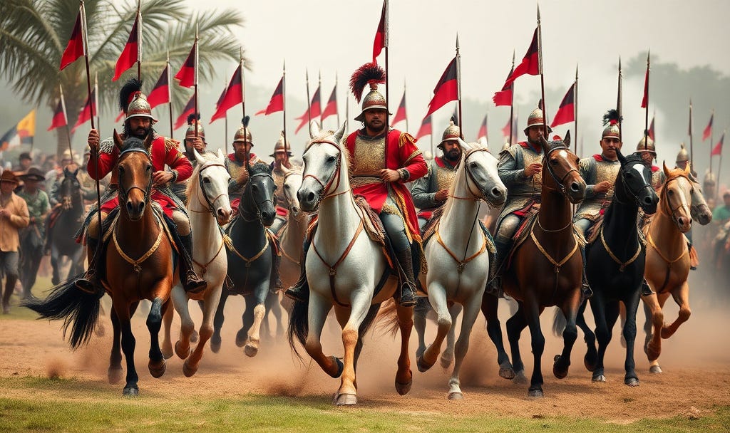 Meanwhile, Cortes and the cavalry were not near for they had to find solid ground out of the swamp earlier. Now they had their way back to help us. The cavalry came charging, horses charging, riders spearing enemy warriors, forcing them to turn tail and flee. The warriors thought the horse and rider were all one animal, like a centaur, for horses they had never seen.
