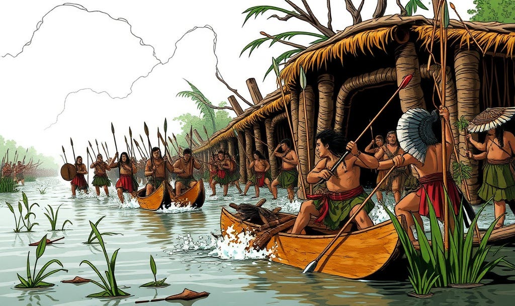 The warriors loosed their arrows at us conquistadors. They beat their drums. They surrounded us in canoes. A shower of arrows kept water splashing in our face. We struggled through the mud and swamp while they fell upon us with lances and shooting arrows. Cortes lost his shoe. The warriors fell back upon stockades built of logs and brush. We pulled this apart and found the gateway to the town. We fought them street to street, through other defenses.