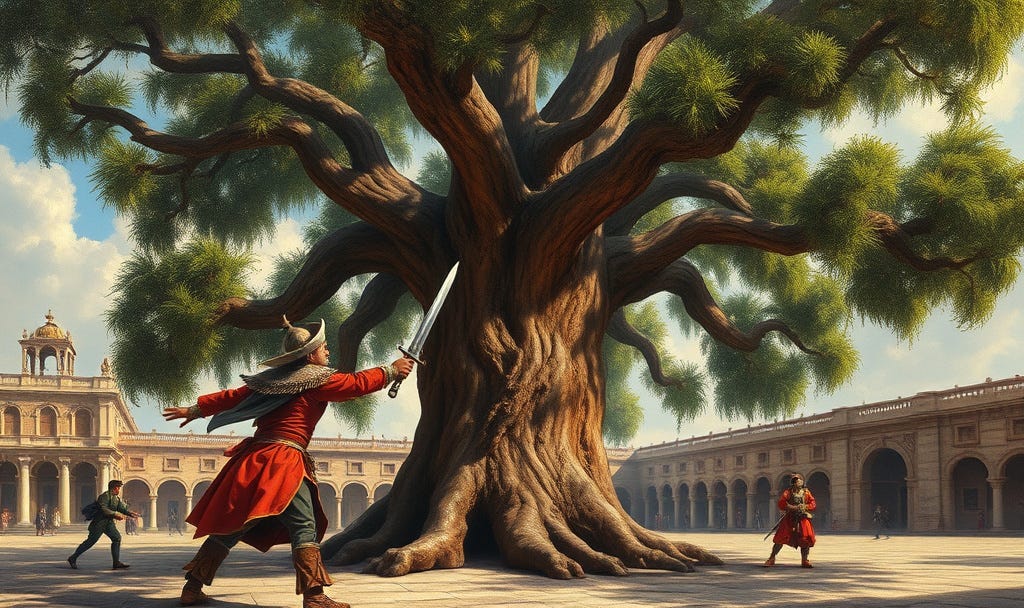 Cortes drew his sword and made three cuts in a huge Ceiba tree, which stood in the court of that great square of the city.