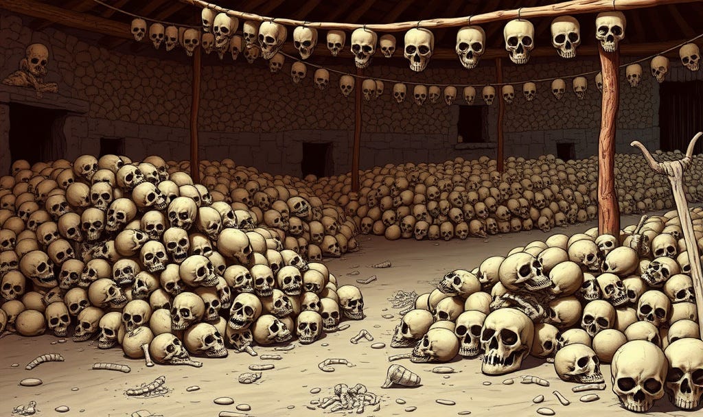I remember in one Tlaxcalan plaza, there were piles of human skulls arranged so they could be counted. There were more than a hundred thousand. Another part of the plaza had pies of thigh bones. There were skulls strung between beams of woods.