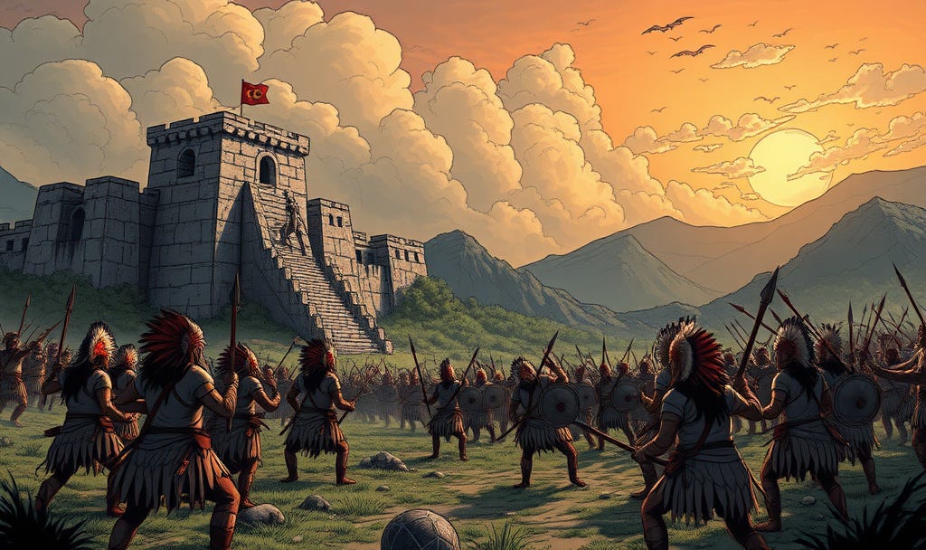 The next morning, we conquistadors mustered the horses and readied our arms, then set out from camp. The plain swarmed with Tlaxcalan warriors and we were 400 men. Some sick and wounded. They charged! A hail of stones sped from slings. Javelins lay like corn on the threshing floor. Men with macahuitls and shields and lances pressed on us with shouts and yells. The steady bearing of artillery and musketeers and crossbowmen was enough to keep them back. Those who closed met our sword play. The enemy were so packed in that our firearms could not miss. Soon they broke away. 1 soldier killed. 60 wounded, including all the horses. I took a stone to the head, and an arrow to the thigh. We returned to camp.